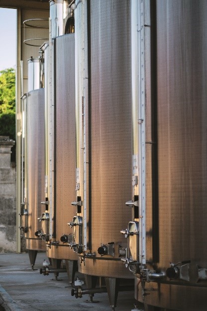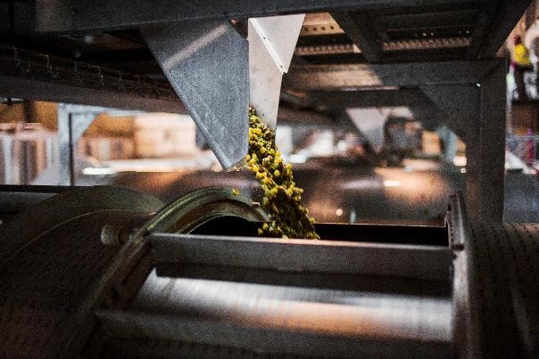 Слева: загрузка винограда Уни Блан в пресс для отжима сока. Справа: цистерны из нержавеющей стали для ферментации виноградного сока и спиртового брожения
